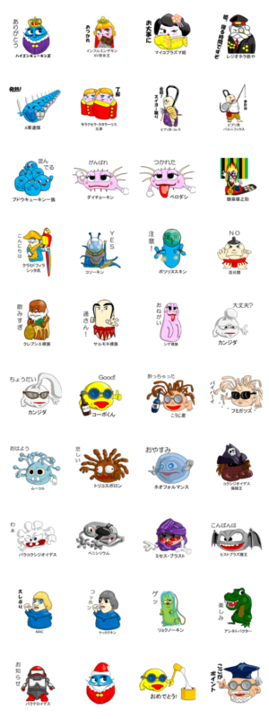 ようこそ、バイキンの世界へ。バイキンをモチーフに、楽しく親しみやすいキャラクターを作りました。例えば、ハイエンキューキン王は肺炎球菌をモチーフにしたものです。染方史郎 より発売