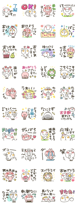まるぴ、くまぴ、うさぴ達が大集合したコラボレーションスタンプです。カラフルでか文字、日常使いの内容です!