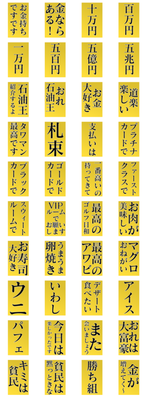 経営者、社長、投資家、芸能人、セレブ、道楽息子、石油王など、お金持ちが使うスタンプです。石油王/お金/経営者/社長/セレブ/芸能人/お金持ち/煽り/毎日使える/デカ文字 ※このスタンプはトークルームで大きく表示されるBIGスタンプです。アケジスタンプ♡ より発売