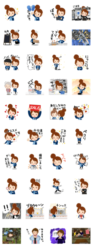 ローソン公式キャラクター、あきこちゃんのスタンプ第2弾です。 制服を着てアルバイトをしているポーズがいっぱいです。