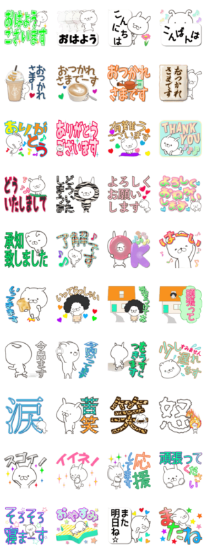 デカ文字のバラエティーパックです。よく使う、おはよう、お疲れ様、ありがとうが多めで、その他、どういたしまして、よろしく、了解、頑張って、など(吹き出し入り♪)