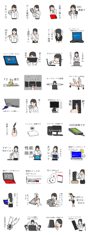 パソコン修理屋さんは日々たくさんのパソコンとお客さんに接して悲喜交々。機械故障と苦悩でいっぱいの日常から、あるあるパティーンをまとめたスタンプです。
