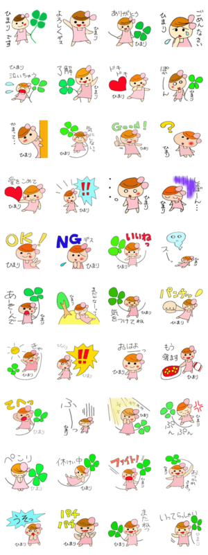 全国のひまりちゃんとその周囲の方々に使っていただけたら嬉しいです。ワンピースを着た小さな女の子をイメージしています。幸せを呼ぶ四葉のクローバーも一緒です。ポチ言う/なまえスタンプ より発売