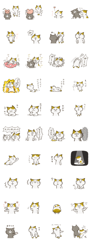嬉しい楽しいが大好きな猫のチャンパチスタンプ第5弾。すねたりしょげたりつっこんだり、お話しやすい相槌系スタンプがたくさん。黒ネコはくまさん。灰ブチはマメキチ。すがわらあい より発売