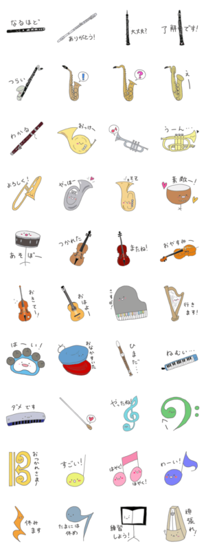 オーケストラや吹奏楽で使う楽器、音楽記号のスタンプです。ラムネ より発売