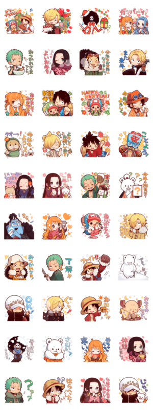 ワンピースの冬に毎日使えるスタンプです。ルフィ、ゾロ、サンジ、ナミ、チョッパー、エース、ロー、ベポ等…クリスマスや大晦日、お正月に使える挨拶等が沢山入っています