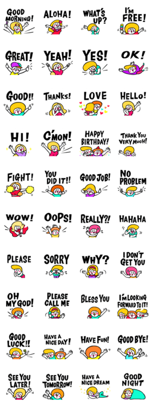 日常で使いやすいシュールでカラフルな英会話のスタンプだよ! くっきりなデカ文字で見やすいYo!Let\'s、英語でトーク!