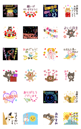 誕生日のお祝いに便利。ネオンや色々なパターンの「おめでとう」と「ありがとう」をパックに♪よく使う、おはよう・おやすみ・了解・お疲れ様と正月(年賀)のおまけ付き♥