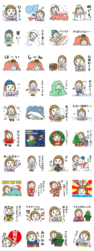 憎めないブスの女スタンプ冬ver.です。お正月やクリスマス、雪だるま、こたつなど♪年賀状にも使える!ブサイクだけど愛嬌がある自虐ネタ満載のスタンプです。キャロライン企画 より発売