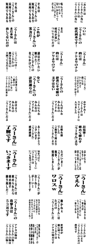 BIGスタンプ/お名前/名字/あだ名/毎日使える/挨拶/日常会話/名言/迷言/写真に使える/うーさん/UHSAN/ウーサン/うしお/うたこ/うらら/うめきち/うさき/うさぎ/うき/うこん ※このスタンプはトークルームで大きく表示されるBIGスタンプです。4A-Studio(よんえーすたじお) より発売