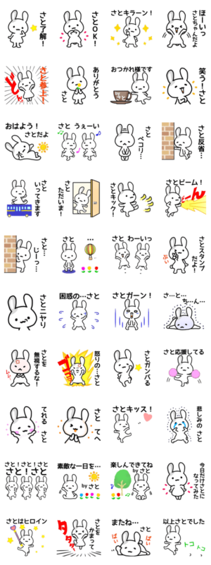 ウサギのサトちゃんスタンプです。聡美さん。智子さん、聡史さん、悟さん、佐藤さん、まだまだ沢山のさとさんへ。宜しければ使ってみて下さい。よろしくお願いします。