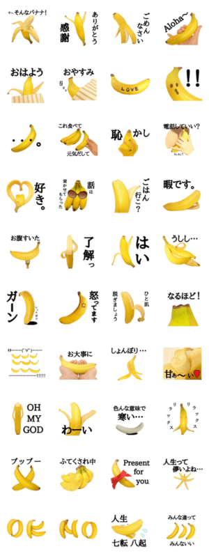 シュールだけどかわいいバナナスタンプ登場! バナナ好きにはもちろん、一風変わったスタンプで友達をひとわらいさせさせたい人にも!gomatan campany より発売