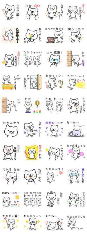 ネコのタカさんスタンプです。たかしさん、貴子さん、高橋さん、高木さん、まだまだ沢山のたかさんへ。宜しければ使ってみて下さい。よろしくお願いします。ペコリ より発売