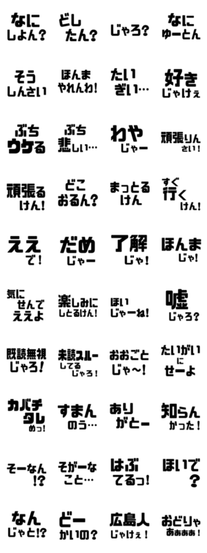中国地方の広島県の文字の方言スタンプ。岡山弁としても使えるよ。広島市や尾道市や呉市や福山市などで使われる方言。友達や家族や彼氏や彼女の恋人同士誰でも使えますしん より発売