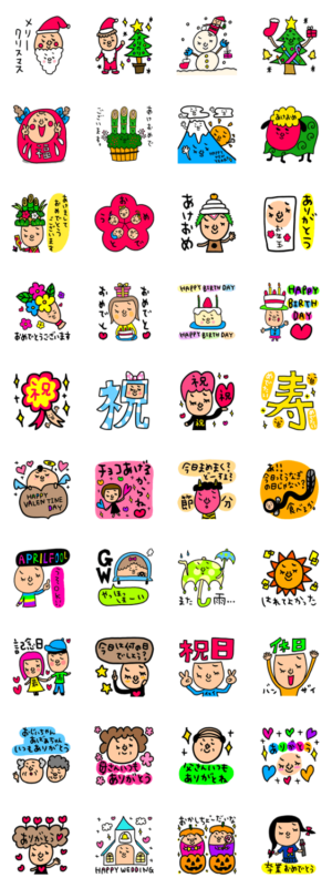 1年を通してお祝い事やおめでたい事に使用できるスタンプだと思います。カラフルなイラストで明るい気分になります。