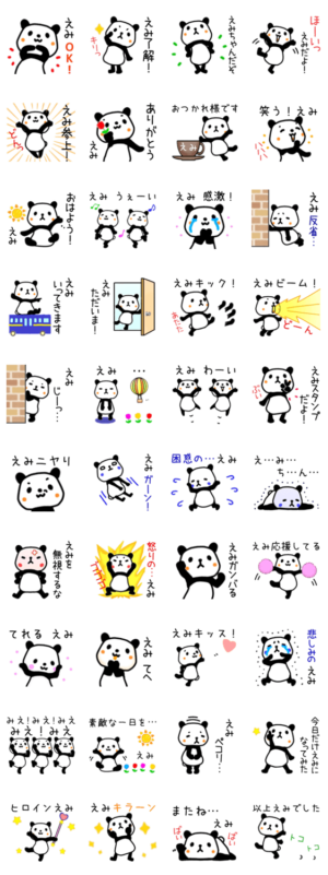 パンダのエミさんスタンプです。恵美さん、絵美さん、栄美子さん、枝美子さん、まだまだ沢山のエミさんへ。宜しければ使ってみて下さい。よろしくお願いします。ペコリ より発売