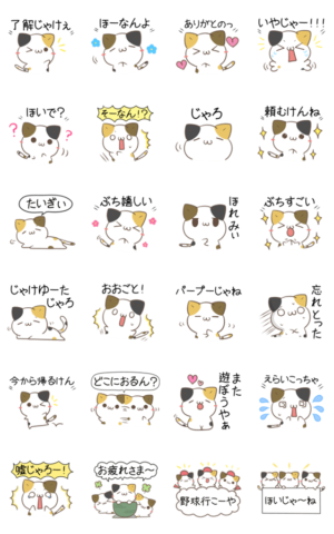 毎日使える広島弁を話す野球好きな三毛猫のミケ達のシンプルで可愛いスタンプ第1弾!パンダverも販売中!山口・岡山・島根・鳥取の方にもつきしろ より発売