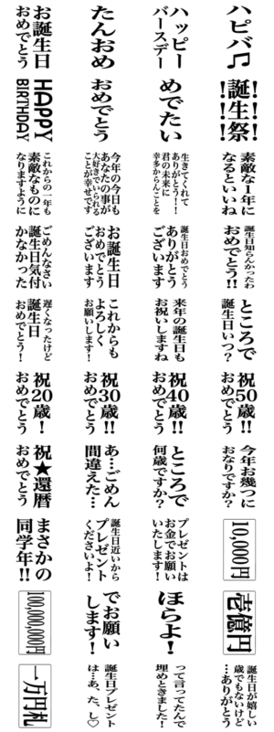 誕生日(*´∀`)ゞおめでとーウヾ(´∀`*) スタンプに書いてある文字一覧