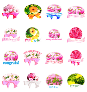 花たちの写真でお祝いの花束を作りました。リボン付き!「おめでとう」「誕生日おめでとう」「Congratulations」など。お花のみのスタンプもあります。lily3 より発売