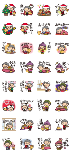 優しくてキュートな「ばぁば」のスタンプ、クリスマスや年末年始にも大活躍の冬バージョンです。Reiko より発売