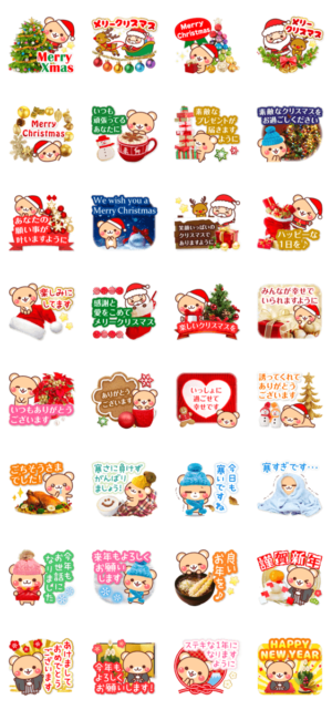 クリスマス、年末年始(大みそか/正月/年賀状)用のスタンプです。Merry Christmas、あけましておめでとうございますなど新年の挨拶も入ってXmasからお正月まで使えます♪Miho Kurosu より発売