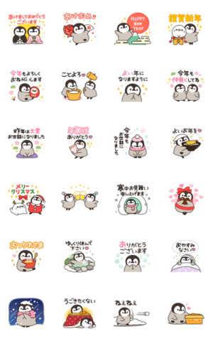 クリスマス・年末年始・お正月に使える!可愛い子ぺんぎんの動く冬のイベント用スタンプ♪あけましておめでとうなど、年賀のあいさつに使える言葉が充実!DECOR より発売