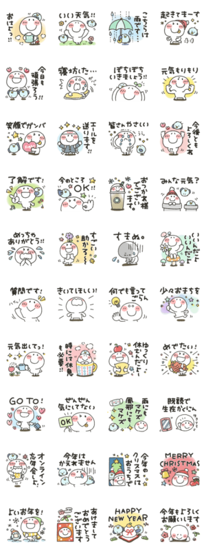 まるぴのスタンプ第79作目。グループやチャットやコメントで使いやすい言葉を集めました。クリスマス年末年始お正月もあります!
