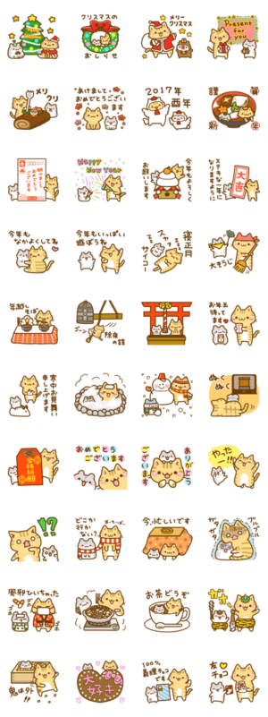 ねこことハム太の冬スタンプ。クリスマス、年末年始、お正月(2017)、合格祈願、節分、バレンタイン等冬のイベントを詰め合わせたかわいい猫とハムスターのスタンプです。
