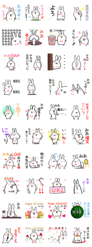 みおちゃん/さん用の可愛いウサギのゆるい名前(なまえ)/あだ名スタンプ。ミオ/美緒/美桜/未央/澪/美央/美愛/みおり/みおこ/ふみお/みおな等の名前の方専用で送ると面白い♪むらびと【名前・アダ名のスタンプ&着せかえ制作】 より発売
