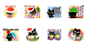 クリスマス、お年越し、正月、冬に便利な行事編。寒いけど元気な黒猫ちゃんです。クリスマスカードや年賀状のように使えるかも?monaka より発売