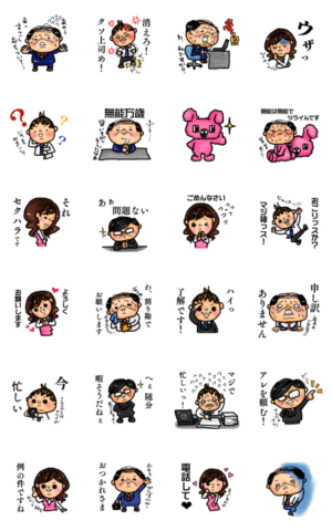オフィスでありがちな日常をスタンプにしました。 ハゲおやじでさえかわいく見える様に少女マンガのような 謎のツヤ点をふんだんに使用したスタンプです。