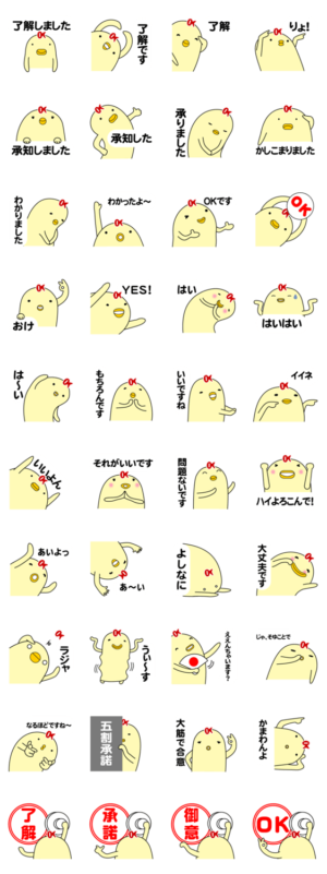 OK型のとさかが可愛いトリが全力で「了解」します。肯定する言葉をたくさん詰め込みました。「かしこまりました」など、丁寧語もあるのでどんな相手でも使えます。