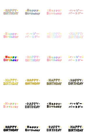 誕生日おめでとうを伝える大人女子のイベントお祝いスタンプ。手書き文字でかわいいコンパクトサイズ。全部HAPPY BIRTHDAY・ハッピーバースデー。小さい/スリム/省スペース