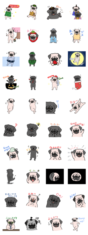 季節のイベントをイメージしたものと、 日常会話で使えるパグのスタンプです!shima zoo works. より発売