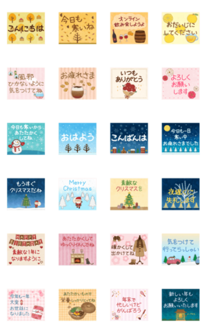晩秋から初冬にかけて…季節の風景を楽しむスタンプ。メッセージスタンプの季節のレターセットシリーズが動くスタンプになりました。クリスマス、大晦日など。