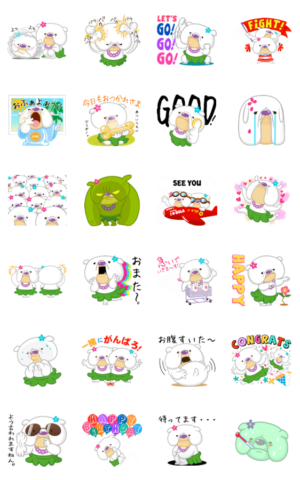 アロハ〜!ボチャロハ島に住むフラダンスが大好きなふたごのブルドック、ブルフラが更にパワーアップしてやってきた! ブルドックファンにもオススメのスタンプだよ!