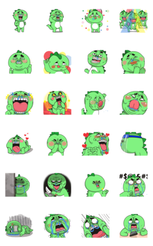 オモシロ怪獣のスタンプで緑色の怪獣のキャラが表情豊かなスタンプです。文字はなくてその分、表情で楽しめます。