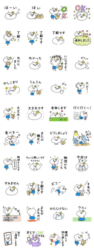 女子力高めな白猫、ネコ子の即レススタンプ。相手を待たせず、文字打ちなしでサッとお返事できます♪作者の趣味で昔言葉もしれっと織りまぜております…。
