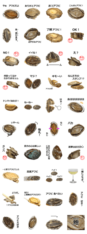あわびの写真を使った実写スタンプです。一眼レフで撮影した超高画質アワビをどうぞ。友達や家族にアワビを送ってびっくりさせよう!鮑大好き♪貝!40個入り。竹野チコ より発売