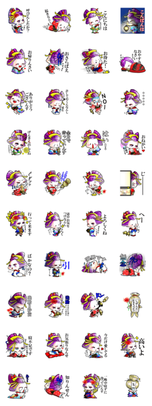 豪華な装いだけではない遊女の日常生活スタンプです。なおみ花魁が手作り人形と一緒におもしろ可愛くあなたを魅了します。ゲスト:藁人形のわらっぽー