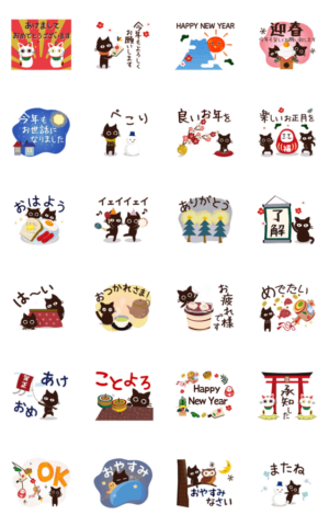 毎年使える!ナチュラルで絵本のようなねこのスタンプ3年末年始Ver。年末年始のあいさつを楽しくしよう!和風で女子力高めな大人可愛い女子向け。門松,鏡餅,招き猫,雪だるまmugiko より発売