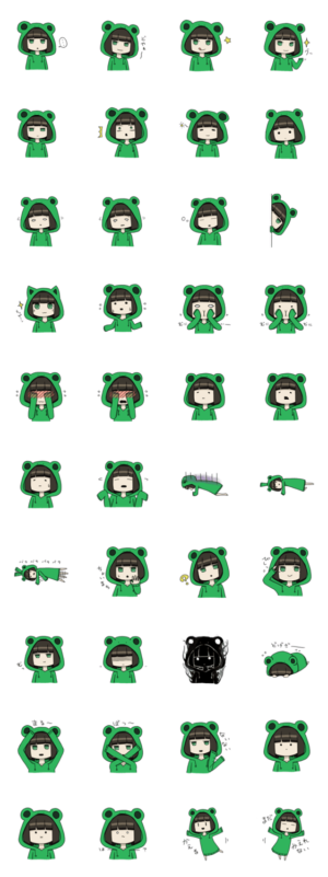 カエルパーカーの女の子です! 自分がよく使う顔文字を参考に様々な場面で使いやすいようなものを目指しました!なべたこ より発売