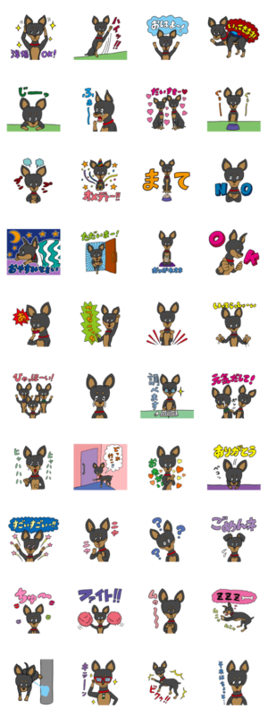 ツヤツヤの毛並みとシャープでスタイリッシュな体形。小柄な見かけより大胆な性格のミニピンのスタンプです♪(スタンプデザイン:大湾 愛佑乃)