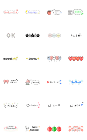 シンプルで小さい横長スタンプ。絵文字、挨拶・返事・お疲れさま・ありがとうなど毎日使う言葉~おめでとう等のイベントも。可愛すぎない大人かわいいスタンプです。第4弾