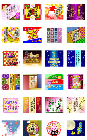 年末年始のイベントに使えるスタンプです。カラフルで使いやすいですね。