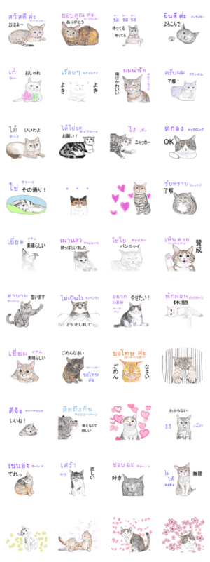 かわいいニャンズのスタンプです。タイ語をミックス。日本語バージョンもあります。puuann naomi より発売