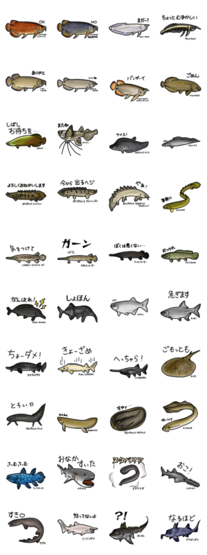 アロワナ・ポリプテルスなどの淡水の古代魚からシーラカンスやラブカなどの海の古代魚まで全40種類がスタンプに!日淡スタンプなど他のシリーズともあわせて使えます!HoME より発売