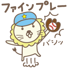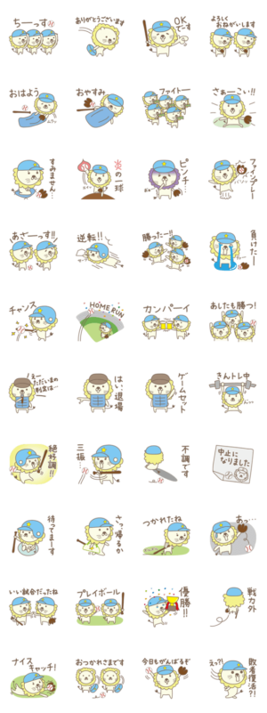 百獣の王らいおんの野球スタンプ。主に、高校野球やWBCやプロ野球のシーズンで使え、また日常会話でも使える言葉のライオンのスタンプもあります。気軽なあいさつでも。