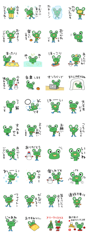 カエルのカエルん。冬編。「今日もひえるね〜」「今年は帰れません」から「オンラインで」まで。クリスマス、年末年始、お正月。家族、学校、お仕事でも。Mami / エストループ より発売