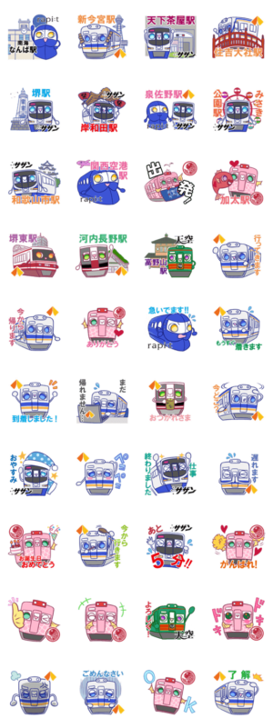 南海電車ファン必見「ラピート」や「めでたいでんしゃ」など色々な車両が、かわいいデザインで公式から登場!家族や友達との日常会話で楽しく使いやすいラインナップです。